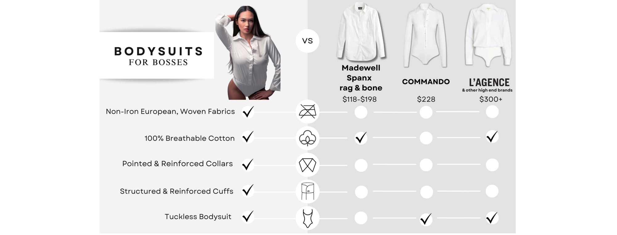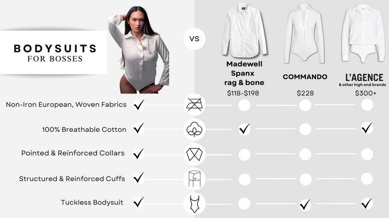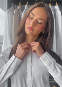 This non-iron, button up bodysuit leaves just enough room for comfort with a straight, classic drape from bust to hip. Our Twill woven fabric creates an organic sheen adding an illumined brilliance to any polished outfit. With formal cuffs and collars, The Bodysuit for Bosses is perfect for staying effortlessly powerful.